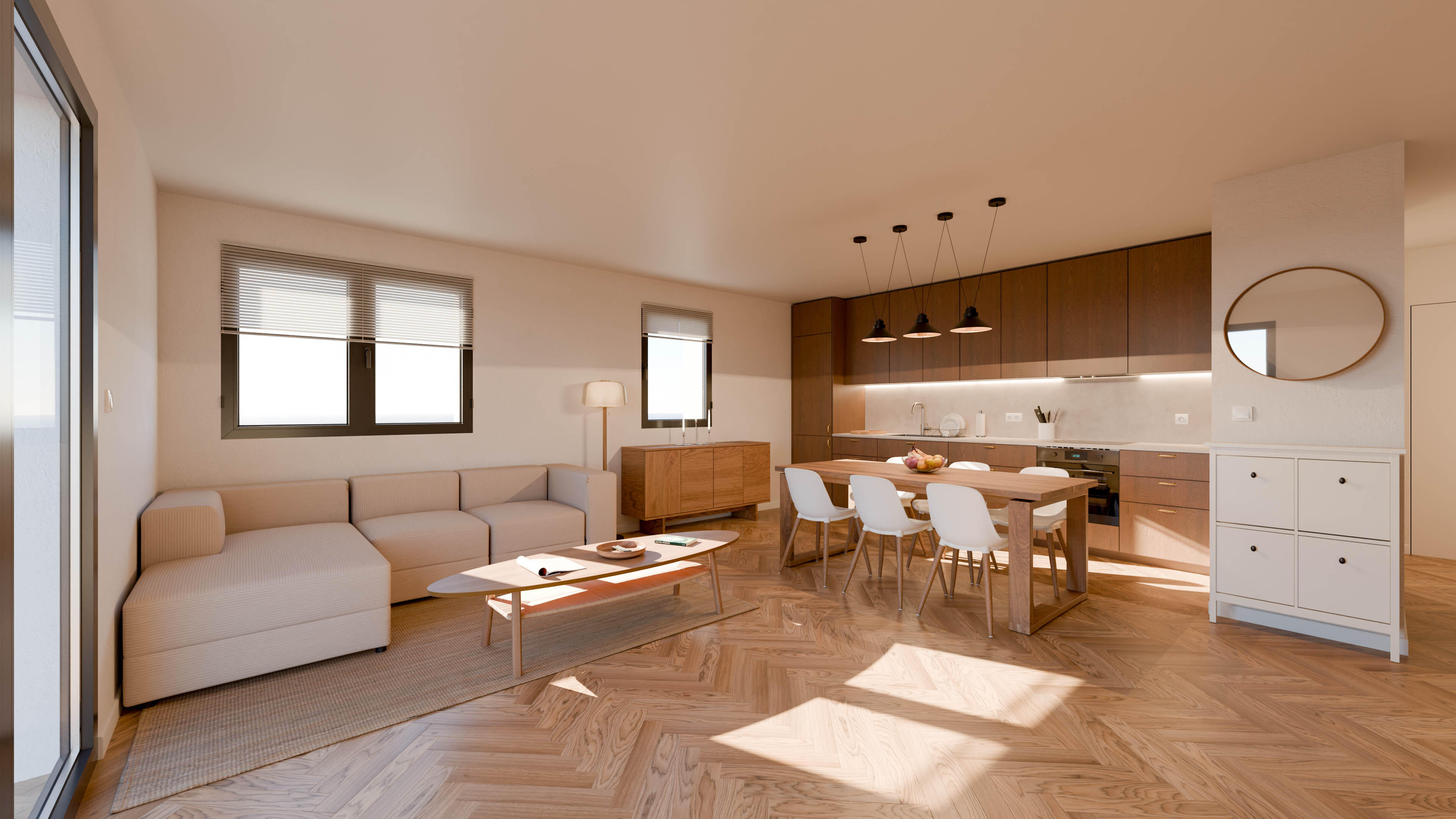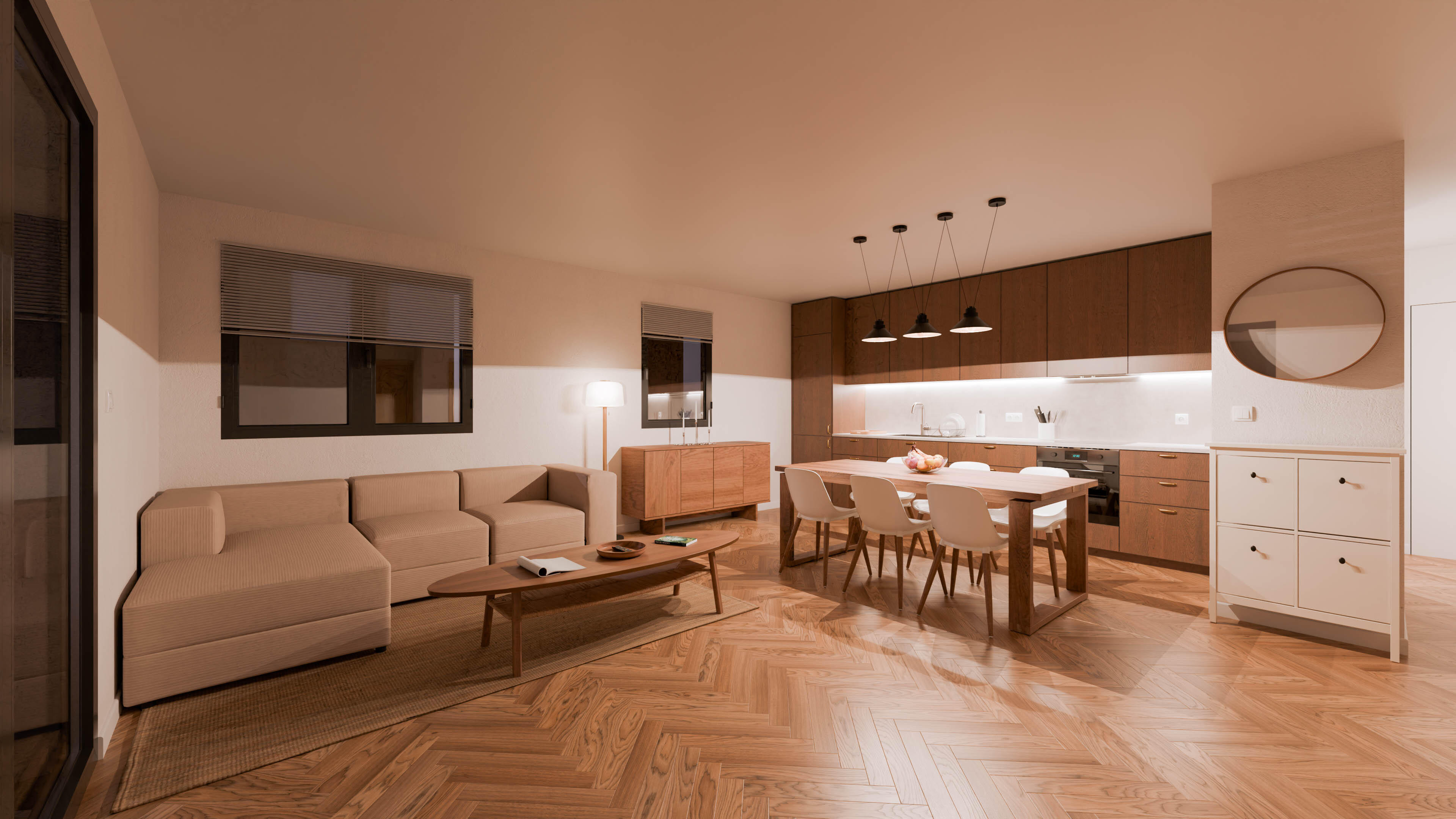 Conception et visualisation 3D d'un espace de vie de 50 m² alliant chaleur et minimalismeMise en avant d'une cuisine de caractère en chêne brun et détails laiton, s'ouvrant sur un salon au tonalités neutresTravail spécifique sur la dualité lumineuse : étude de l'ensoleillement diurne et création d'une ambiance nocturne feutrée